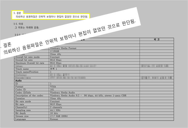 〈녹취파일이 편집되지 않았다는 결과가 나온 보고서 일부〉