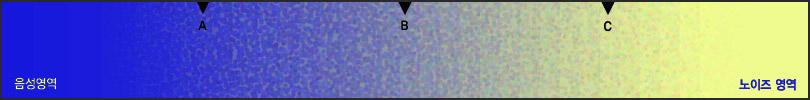 모든 소리는 위 그림에서 보시는 것처럼 음성과 노이즈 영역의 경계가 매우 불분명하게 섞여 있는 상태여서 A, B, C 지점 어느 하나를 기준으로 단순하게 노이즈를 감쇄작업을 수행한다면 필연적으로 음의 왜곡(A지점)이 발생하거나 공명(B지점) 또는 감쇄 효과가 미미(C지점)한 상황이 발생하게 됩니다.